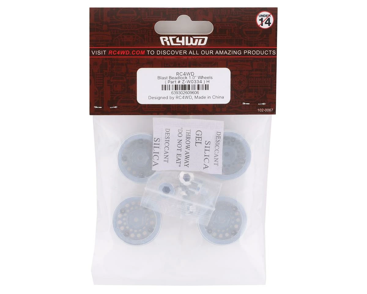RC4WDÂ Blast Beadlock 1.0″ Wheels. These scale beadlock wheels are made from CNC-machined aluminum for a perfect fit and finish. Intended for the RC4WD 1/18 Gelande II, however, they can be used with the Axial SCX24 when paired with RC4WD 1.0″ tires. Package includes four beadlock wheels.