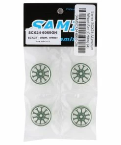 The Samix SCX24 Aluminum 1.0″ Wheel Set is a great way to add some bling and some weight to your SCX24. Made from CNC machined aluminum these 1 inch wheels feature chamfered edges and work with standard SCX24 tires. Package includes four green wheels.Â