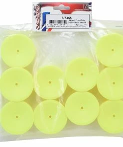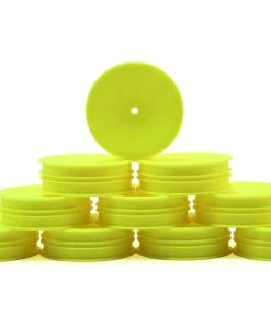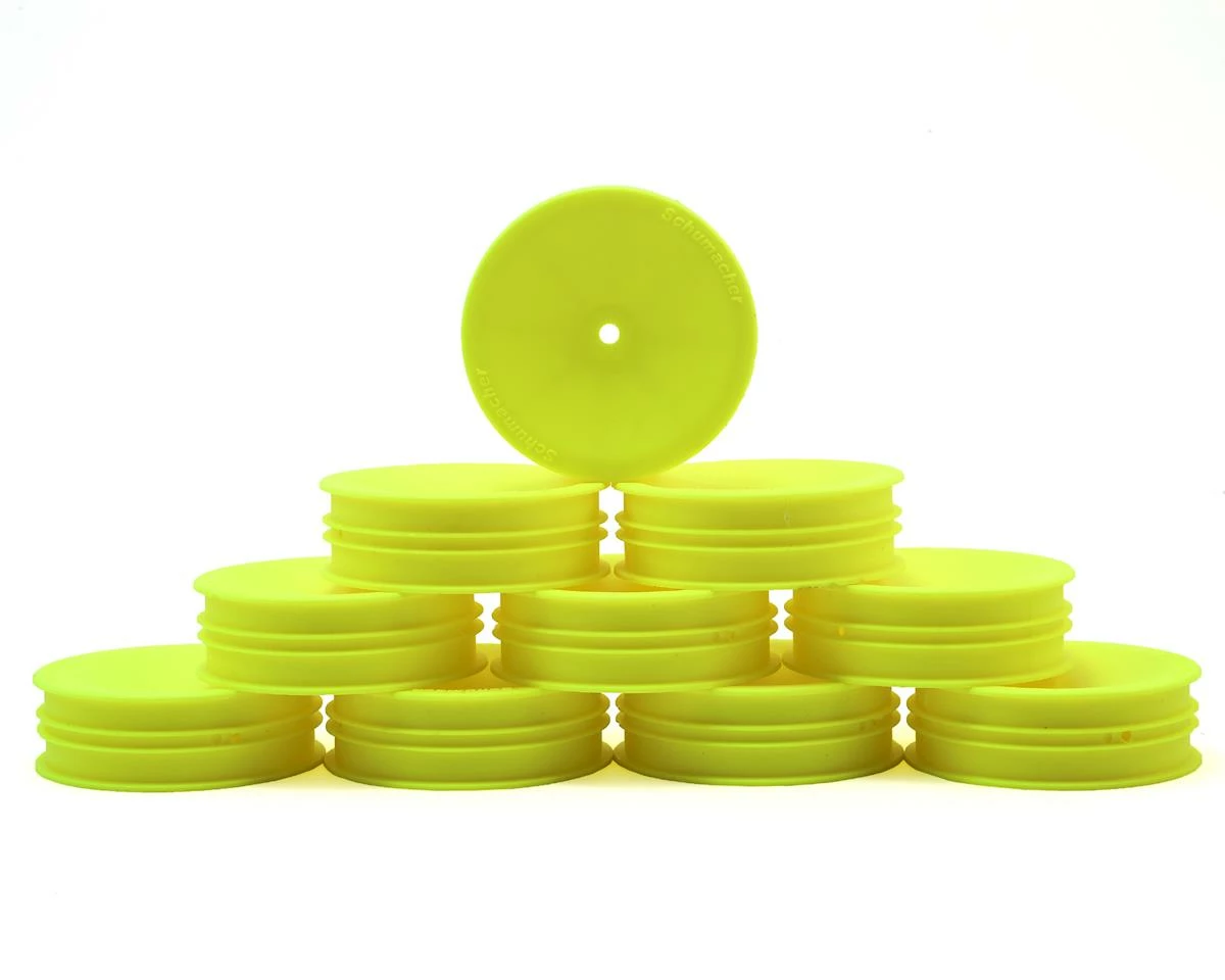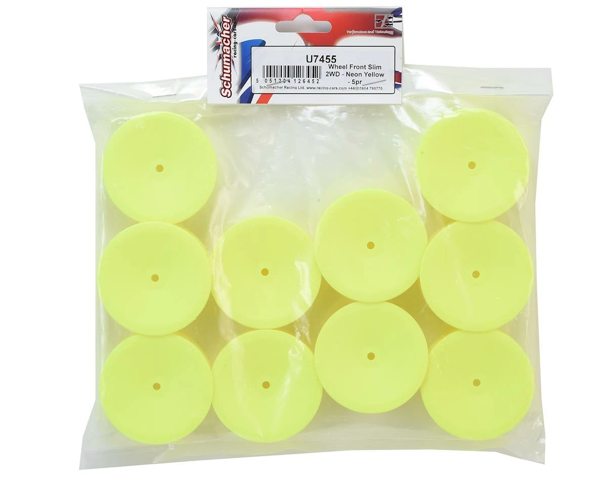 Schumacher 12mm 1/10 2WD Buggy Front Hex Wheels are compatible with 1/10 scale 2WD buggies that use a 12mm hex. These “Slim” wheels measure in at 20mm wide and are suitable for the popular Schumacher slim tires such as Low Profile Cut Staggers and the original Staggers. No more cutting down of Medium wheels and they’re pre-vented with two holes! Package includes ten yellow wheels.