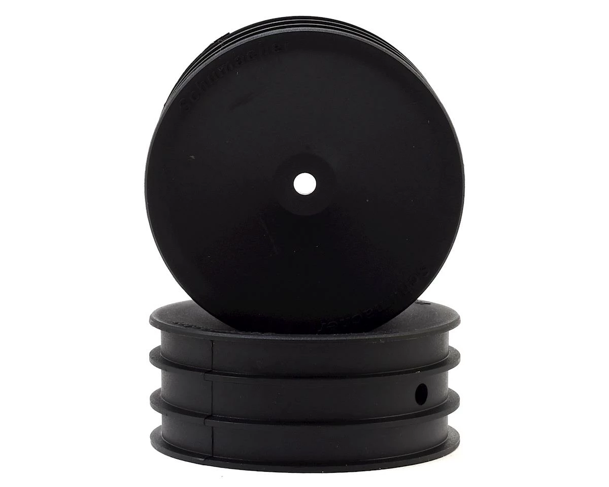 This is a pack of two replacement Schumacher 12mm Hex 1/10 2WD Front Buggy Wheels in Black color. These wheels are for use on the front of a 2WD Buggy only, and feature a 12mm hex.Â