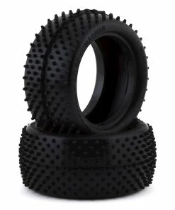 Schumacher Mezzo 1/10 Buggy Rear Tires feature a completely redesigned carcass, with development focused on the thickness of the profile to support the pin and improve the life span. The Mezzo has a varied pin type across the tire, enabling it to be more suitable to a wider variety of track conditions, including long and short pile astro. The pin type gives improved side traction whilst maintaining forward traction. Also, the Mezzo lasts longer and provides great bump handling thanks to the taller sidewall profile.