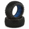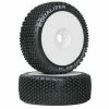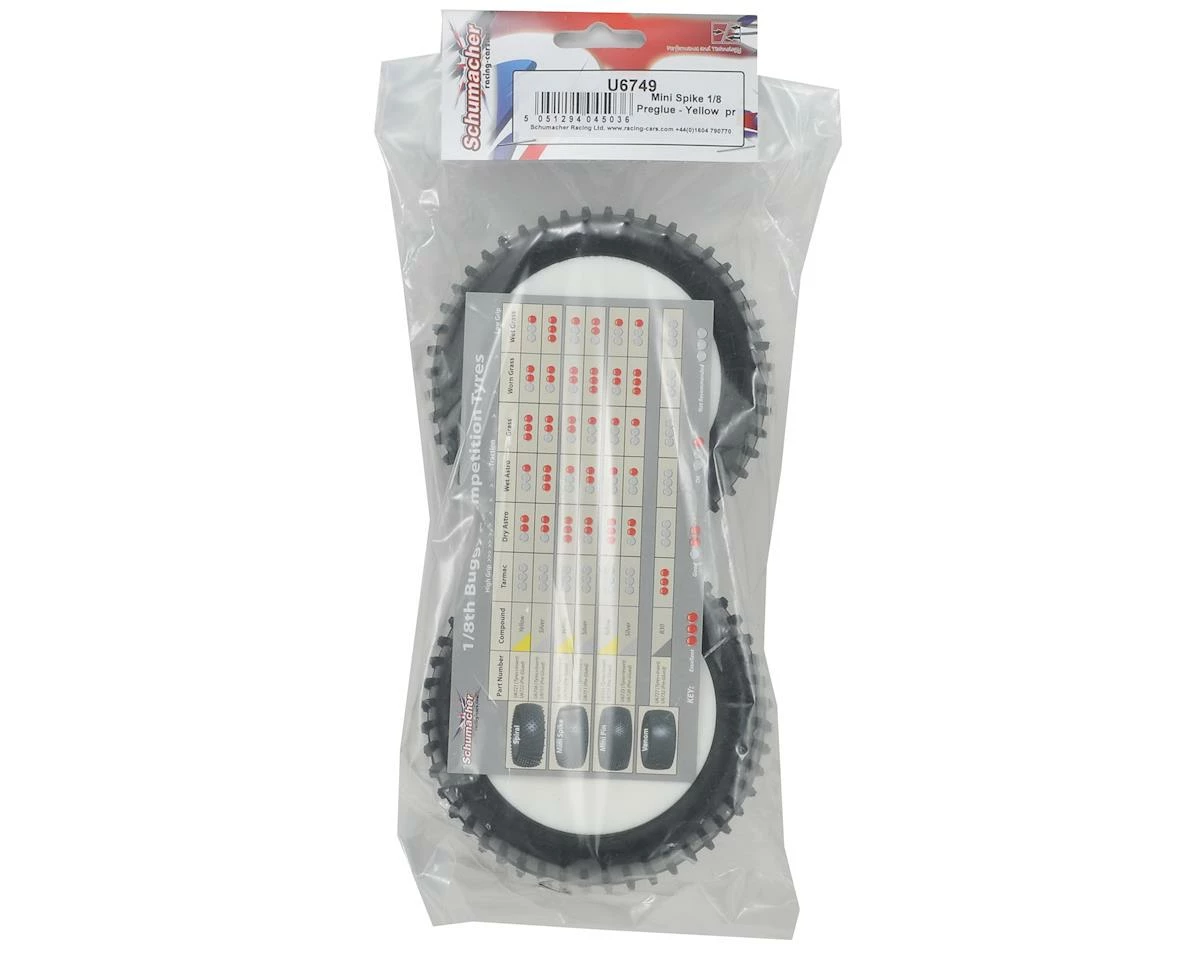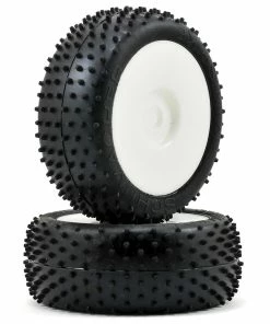 This is a set of two Schumacher “Mini Spike” 1/8 Buggy Tires. These tires have been pre-mounted on white dish wheels. The Schumacher Mini Spike 2 tire is the control tire used for a majority of races in the UK, making it an excellent choice for a variety of outdoor track conditions.
