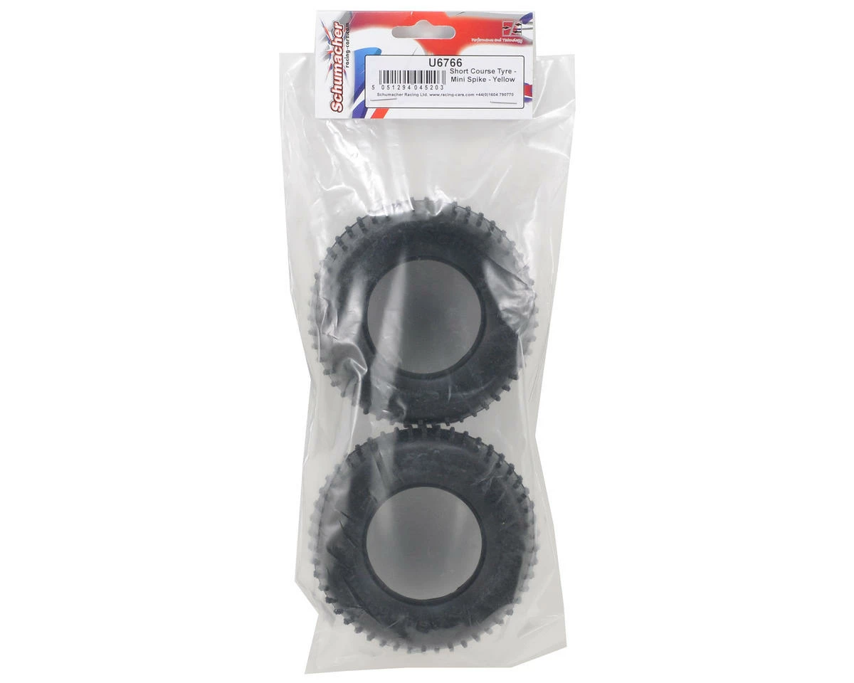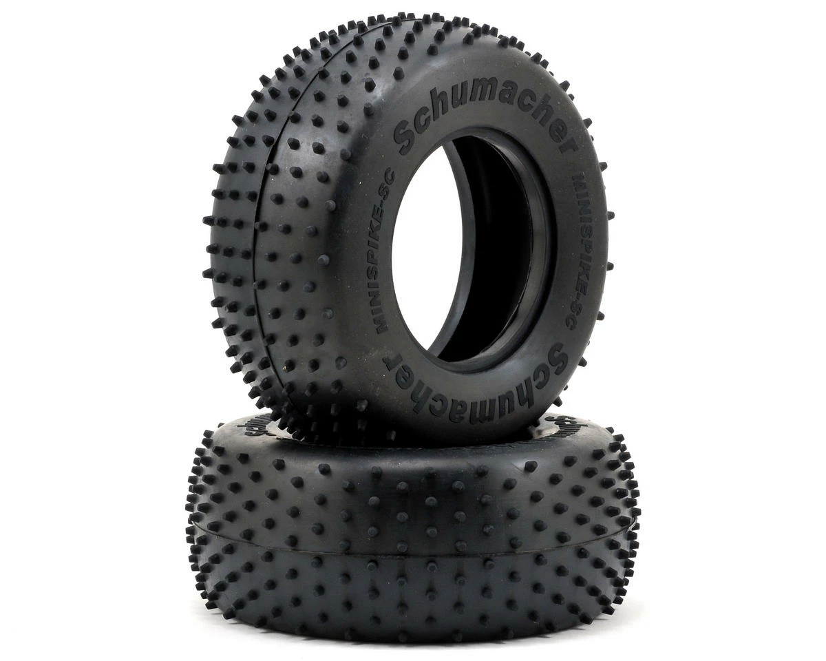 This is a set of two Schumacher “Mini Spike” Short Course Tires. The Mini Spike tire is a good all around tire, but is an excellent choice for Astroturf and Carpet surfaces. This aggressive tire offers maximum traction, and the tire can be tuned by trimming pins to reduce bite. You can also mix compounds, using a hard tire on the front and a soft tire on the rear to help with aggressive oversteer or a loose handling condition, or a soft tire on the front and a hard tire on the rear to help with excessive understeer or a tight handling vehicle.Â
