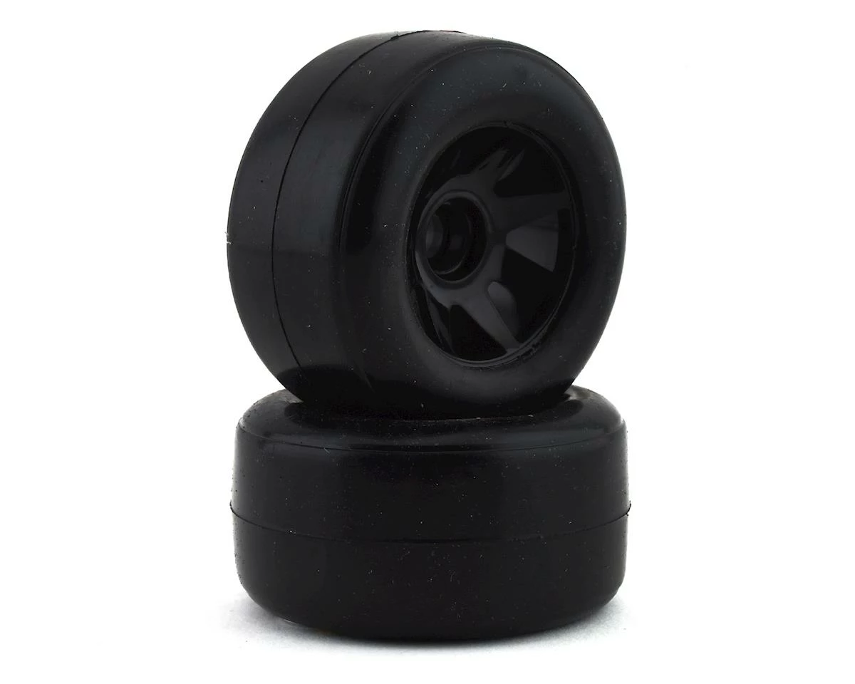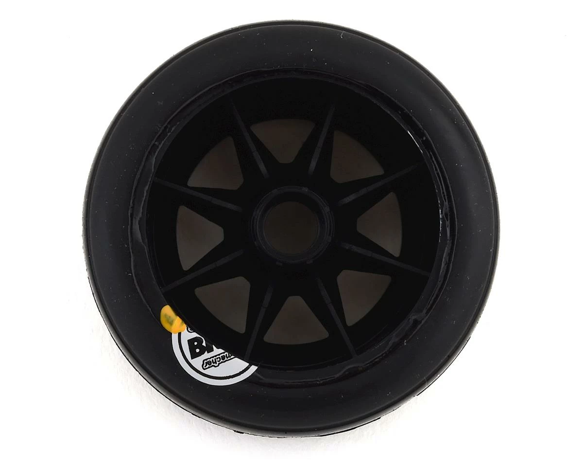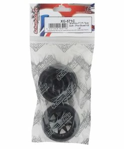 This is a set of Schumacher Shimizu F1 Front Pre-Glued V2 Tires. These V2 spec tires are pre-mounted on CRC wheels and are best suited to carpet racing applications.