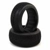 This is a set of two Schumacher “Spiral” 1/8 Buggy Tires. The Spiral tire was designed for surfaces that need more penetration of the ground to gain grip, like grass and loose dirt. Spiral tires feature large pins, in a directional ‘spiral’ pattern that spaces the pins closer together on one side of the tire, and farther apart on the other side. This design allows you to alter the lateral grip characteristics of the tire, without affecting the forward bite. This is done by changing which side of the tire is mounted to the outside of the rim. With the close spaced pins on the outside, the tires will offer the most lateral grip they can produce. With the far spaced pins on the outside, it will reduce lateral grip.