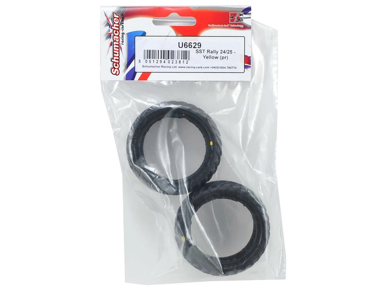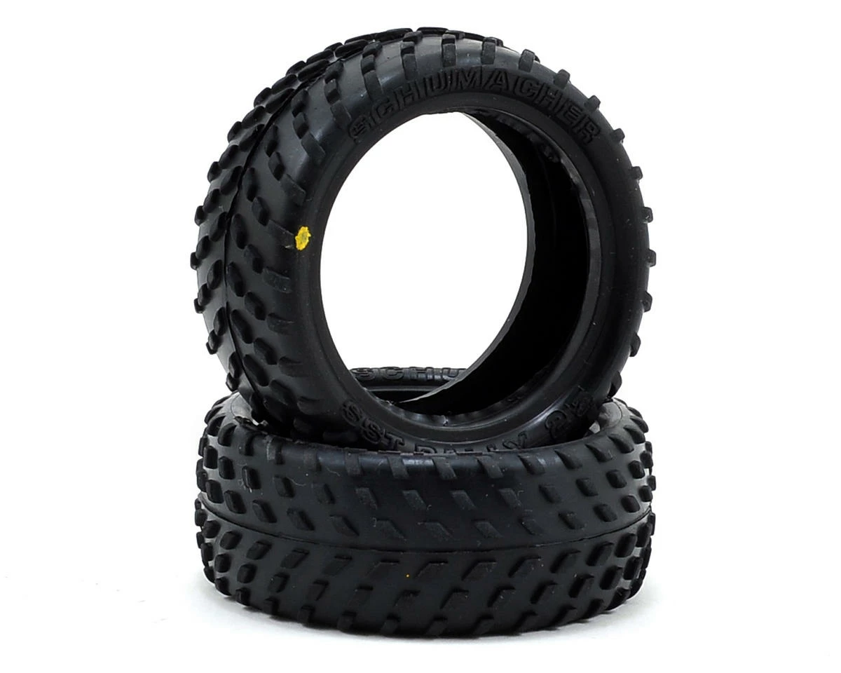 This is a pair of Schumacher SST Rally Tires, intended for use with the 1/10 scale touring car wheels. These rally tires are suitable for a wide range of surfaces and feature all purpose direction lugs. Available in soft yellow and white compounds.