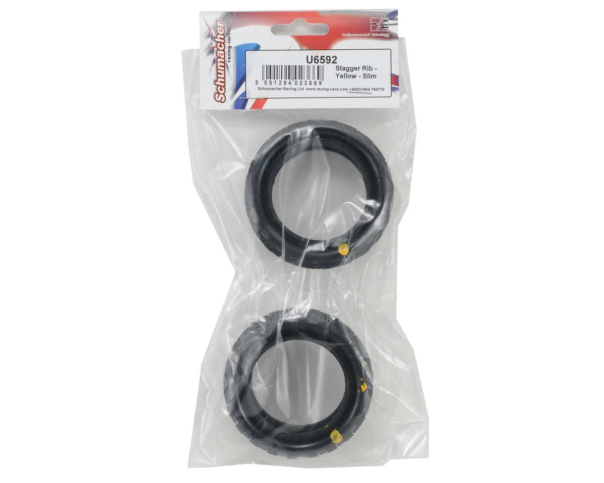 This is a set of two Schumacher “Stagger Rib” Slim 1/10 2WD Buggy Front Tires.Â