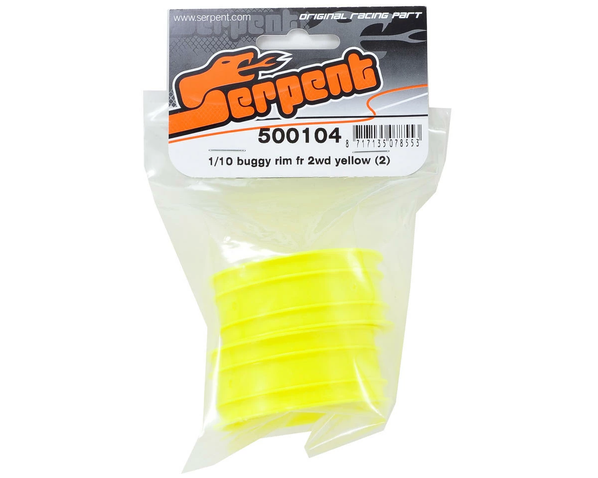 This is a pack of two yellow Serpent Front 1/10 Buggy Wheels.Â