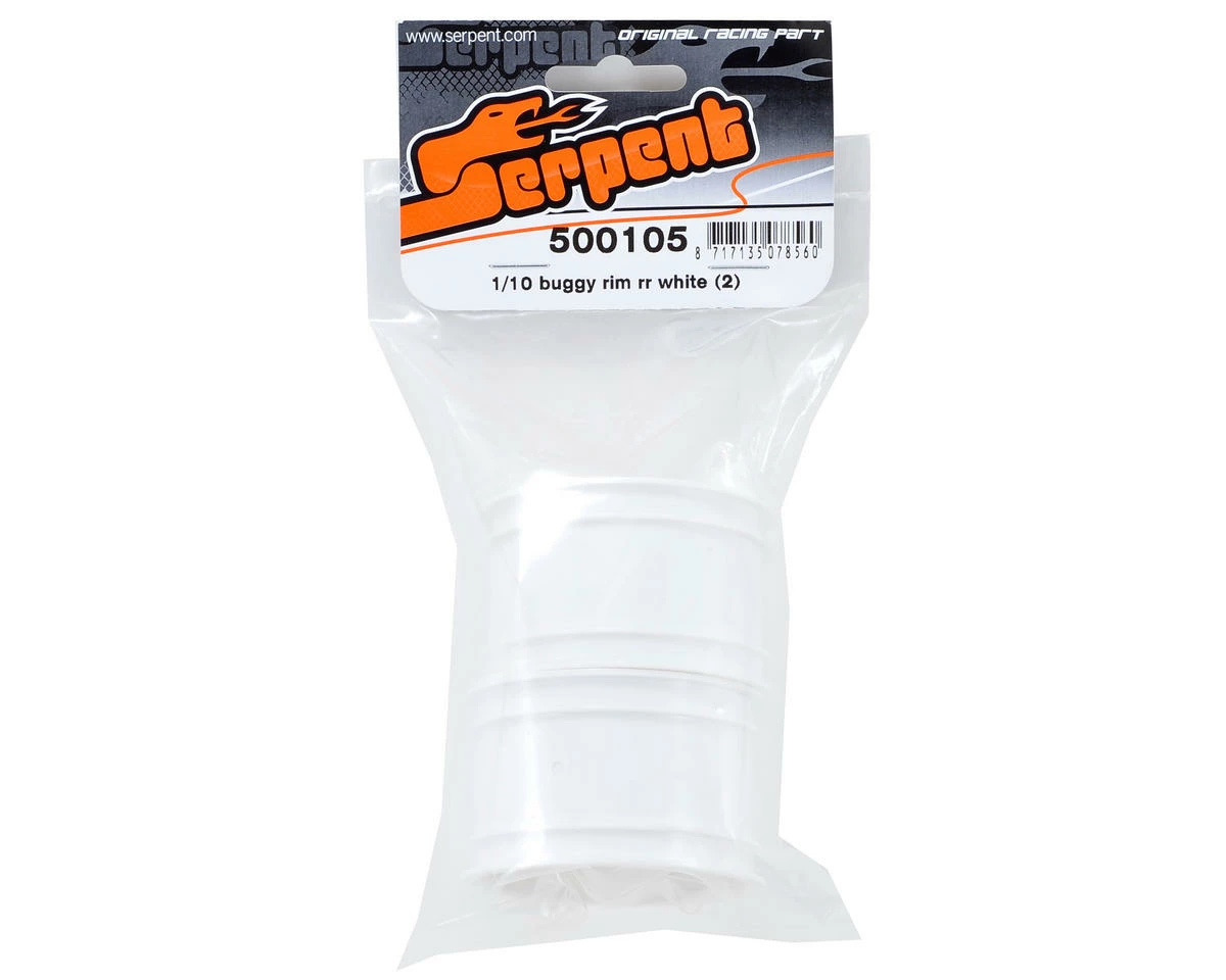 This is a pack of two white Serpent Rear 1/10 Buggy Wheels.Â