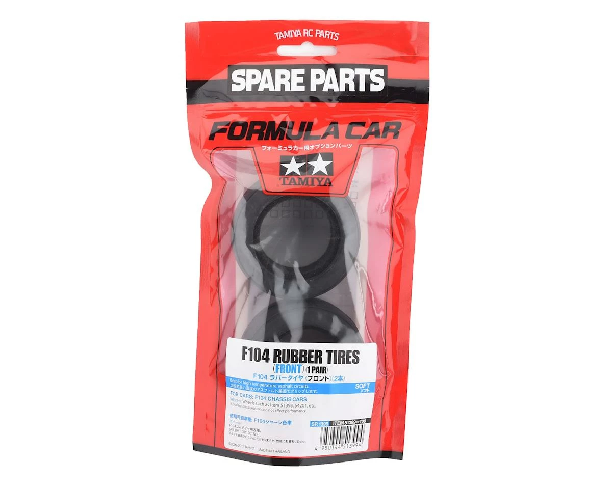Tamiya F104 Rubber Front Tires. These are the stock replacement front tires for the Tamiya F104 chassis. They are belted tires and are recommended for use when track temperatures exceed 95 degrees. As track temperatures drop below 95 degrees grip levels drop accordingly.