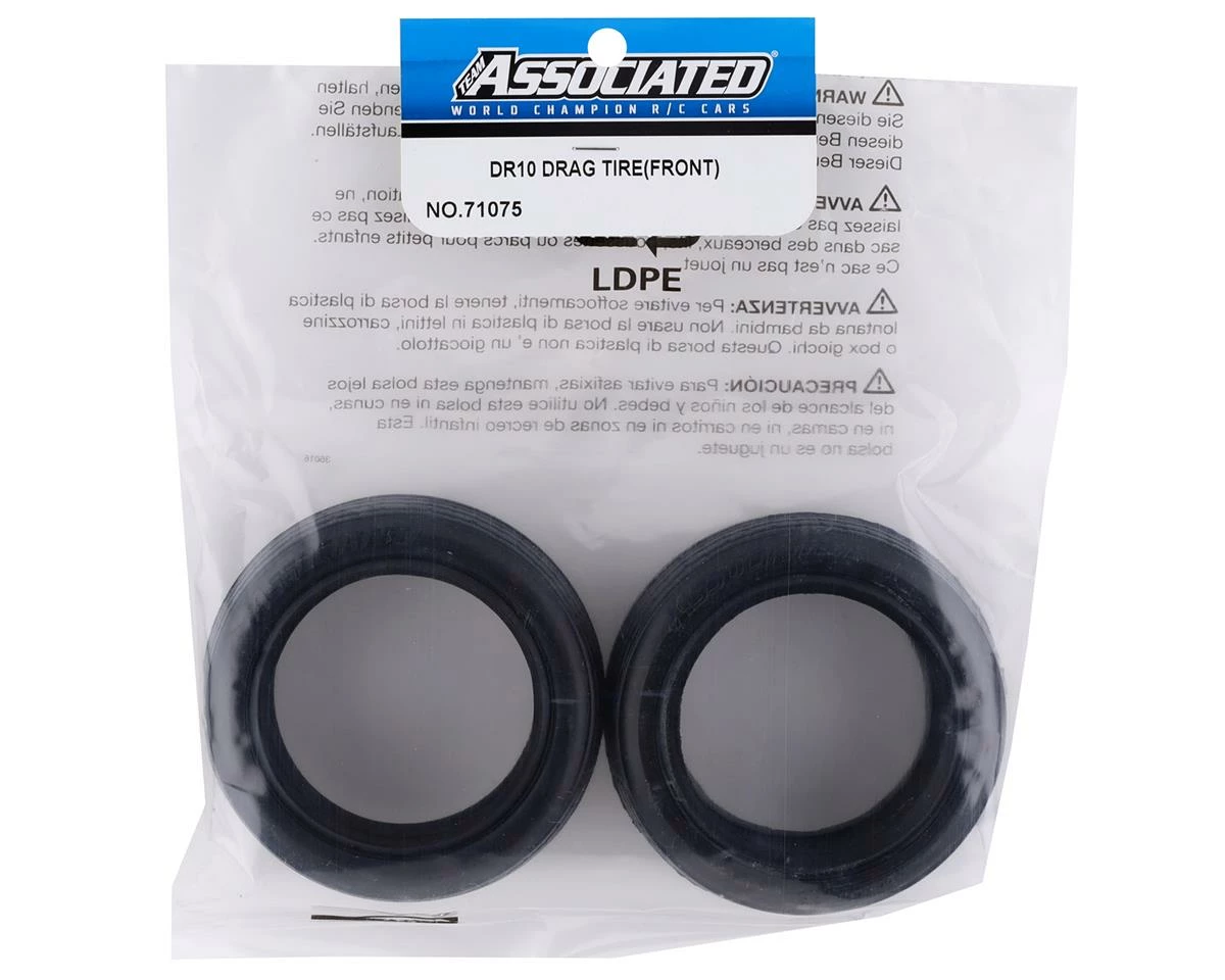 Team Associated DR10 Front Drag Tires. Package includes two replacement tires and two foam inserts.Â