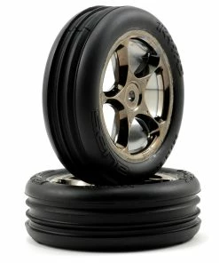 This is a pack of two Traxxas Alias Front Tires, mounted on Tracer 2.2″ Wheels. These are the stock tire included with the Traxxas Bandit and feature a classic rib tread pattern. Choose from a Black Chrome or Chrome finish.