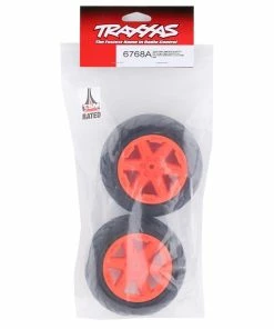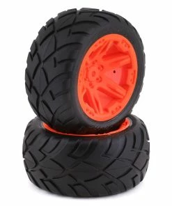 Traxxas Anaconda 2.8″ Pre-Mounted Tires with RXT Electric Rear Wheels. Anaconda performance street tires feature a specially formulated tire compound providing a long lasting traction. These tires are mounted and pre-glued on tough RXT orange wheels. Molded-foam inserts coupled with the directional tread design provide a balanced feel for the ultimate high-speed on-road experience. These optional pre-mount tires are intended for the rear of the Traxxas Rustler 2WD. Package includes two pre-mounted tires.