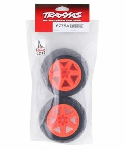 Traxxas Anaconda 2.8″ Pre-Mounted Tires with RXT Wheels. Anaconda performance street tires feature a specially formulated tire compound providing a long lasting traction. These tires are mounted and pre-glued on tough RXT orange wheels. Molded-foam inserts coupled with the directional tread design provide a balanced feel for the ultimate high-speed on-road experience. These optional pre-mounts may be used on the front of the Traxxas Rustler 2WD and the front or rear of the Traxxas Rustler 4×4. Package includes two pre-mounted tires.