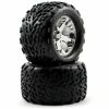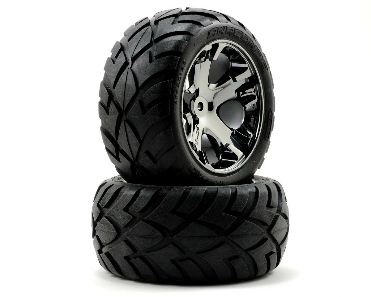 This is a set of two Traxxas Anaconda tires, premounted on chrome All-Star rear wheels, and are intended for use with Traxxas Rustler electric trucks. Choose from Chrome, or Black Chrome finish wheels.