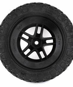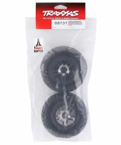 This is a set of two Traxxas BFGoodrich Mud-Terrain TA Tires, Pre-Mounted on SCT Split-Spoke Wheels. These are intended for use on the front and rear of the Traxxas Slash 4×4, as well as the rear of the Traxxas Slash 2wd trucks. These are the fully licensed BFGoodrich Mud-Terrain T/A tires, and have been proven performers in TORC series competition. The distinctive tread design has been faithfully re-created, complete with white sidewall lettering and is available in both standard “hard’ and race proven “S1” soft compounds to suit a variety of conditions. Standard compound is a long wearing rubber blend that will stand up to abuse on concrete and pavement, while S1 compound delivers precise steering and incredible grip for the Slash 4X4, and is ideal for improving rear bite on the 2WD Slash.Â