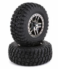 This is a set of two Traxxas BFGoodrich Mud-Terrain TA Tires, Pre-Mounted on SCT Split-Spoke Wheels. These are intended for use on the front and rear of the Traxxas Slash 4×4, as well as the rear of the Traxxas Slash 2wd trucks. These are the fully licensed BFGoodrich Mud-Terrain T/A tires, and have been proven performers in TORC series competition. The distinctive tread design has been faithfully re-created, complete with white sidewall lettering and is available in both standard “hard’ and race proven “S1” soft compounds to suit a variety of conditions. Standard compound is a long wearing rubber blend that will stand up to abuse on concrete and pavement, while S1 compound delivers precise steering and incredible grip for the Slash 4X4, and is ideal for improving rear bite on the 2WD Slash.Â