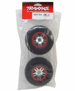 This is a set of two Traxxas BFGoodrich Mud-Terrain TA Tires, Pre-Mounted on SCT Split-Spoke Wheels. These are intended for use on the front and rear of the Traxxas Slash 4×4, as well as the rear of the Traxxas Slash 2wd trucks. These are the fully licensed BFGoodrich Mud-Terrain T/A tires, and have been proven performers in TORC series competition. The distinctive tread design has been faithfully re-created, complete with white sidewall lettering and is available in both standard “hard’ and race proven “S1” soft compounds to suit a variety of conditions. Standard compound is a long wearing rubber blend that will stand up to abuse on concrete and pavement, while S1 compound delivers precise steering and incredible grip for the Slash 4X4, and is ideal for improving rear bite on the 2WD Slash.Â