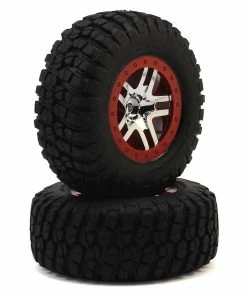 This is a set of two Traxxas BFGoodrich Mud-Terrain TA Tires, Pre-Mounted on SCT Split-Spoke Wheels. These are intended for use on the front and rear of the Traxxas Slash 4×4, as well as the rear of the Traxxas Slash 2wd trucks. These are the fully licensed BFGoodrich Mud-Terrain T/A tires, and have been proven performers in TORC series competition. The distinctive tread design has been faithfully re-created, complete with white sidewall lettering and is available in both standard “hard’ and race proven “S1” soft compounds to suit a variety of conditions. Standard compound is a long wearing rubber blend that will stand up to abuse on concrete and pavement, while S1 compound delivers precise steering and incredible grip for the Slash 4X4, and is ideal for improving rear bite on the 2WD Slash.Â