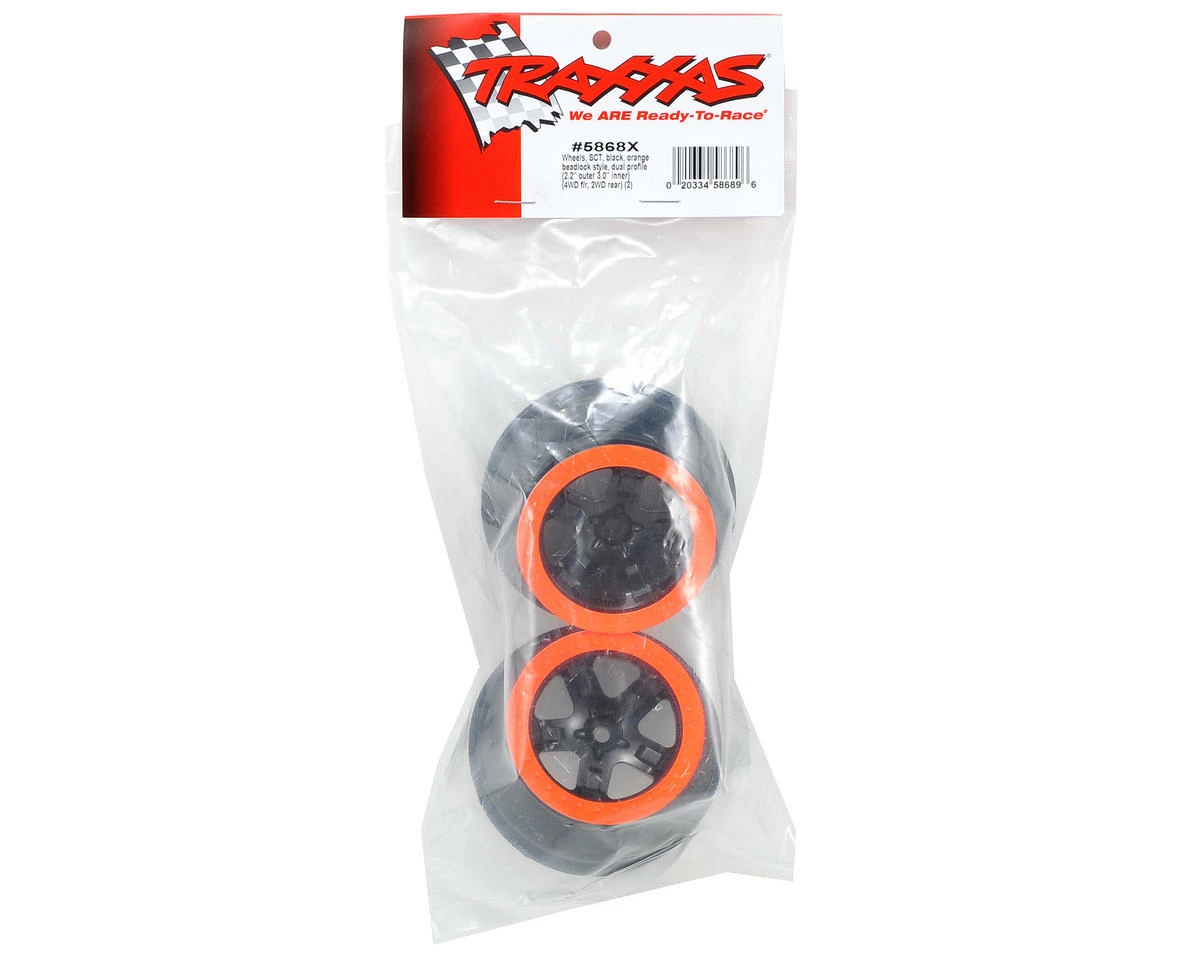 This is a set of two Traxxas 2.2/3.0 Dual Profile SCT Rear Black Wheels with an Orange Beadlock, and are intended for use on the front and rear of the Traxxas Slash 4×4 and the rear of the Traxxas Slash. The design of the SCT wheel features a black center and color molded orange beadlock detail for a realistic look. Fully compatible with factory Traxxas and aftermarket 2.2/3.0 tires, the wheels feature 12mm hexes and the same offset as Slash 2wd rear wheels.
