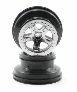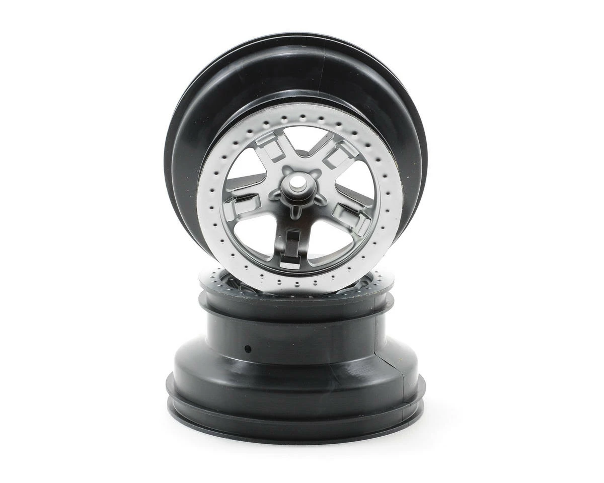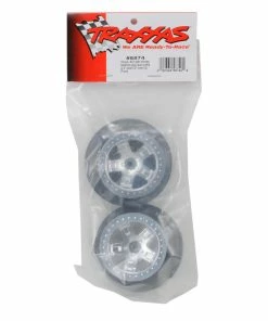 This is a set of two optional Traxxas Slash Satin Chrome Front Wheels. These wheels allow you to add instant “beadlock” style to your Slash and Slayer with Traxxas’ latest option wheels. The beadlock trim is molded in color for good looks that last, while the satin-chrome center section provides the perfect contrast.