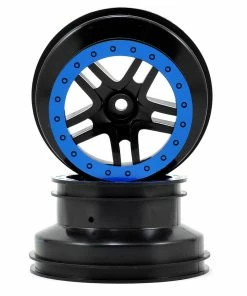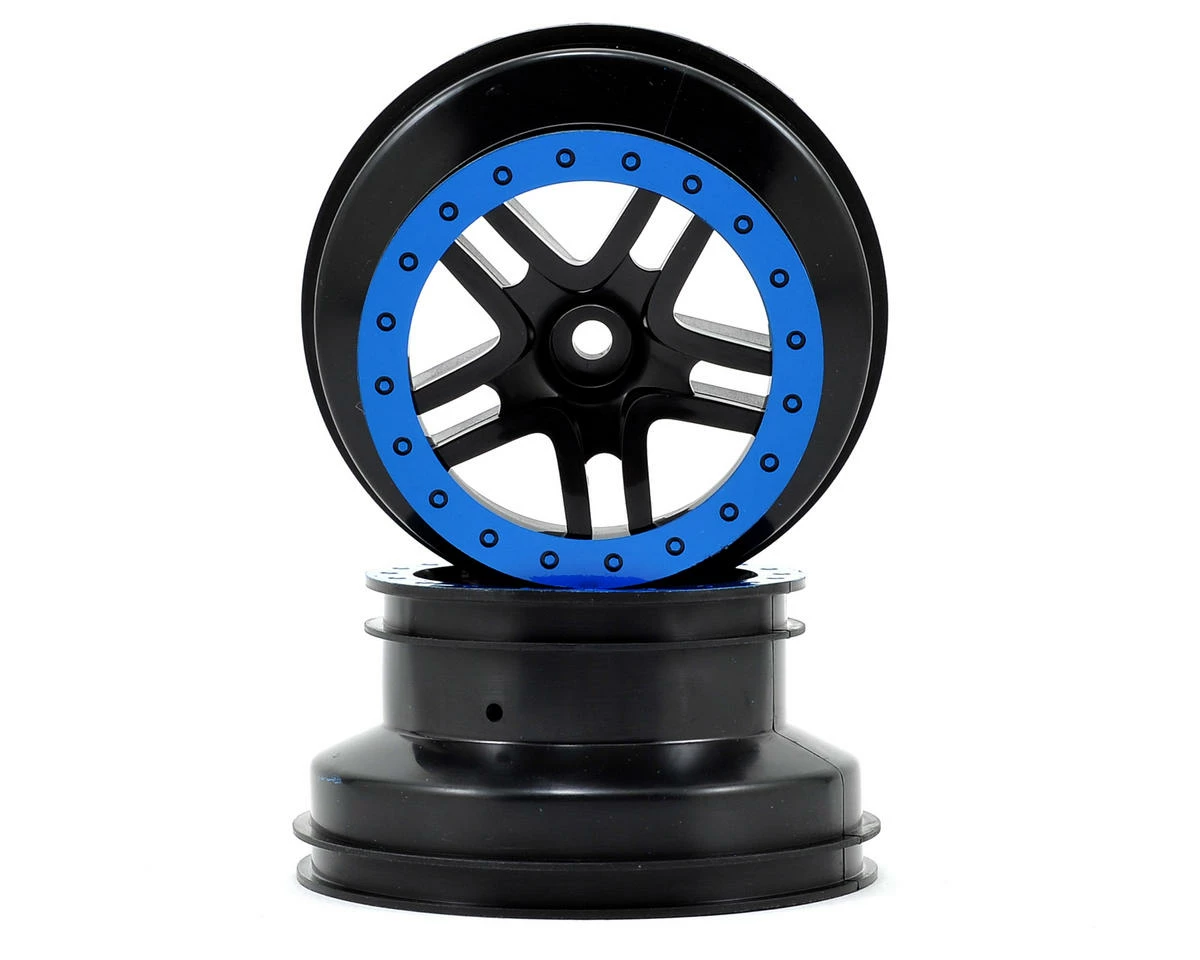 This is a set of two Traxxas 2.2/3.0 Dual Profile Split-Spoke SCT Front Black Wheels with a Blue Beadlock, and are intended for use on the front of the Traxxas Slash 2WD. The design of the Split-Spoke SCT wheel features a black center and color molded blue beadlock detail for a realistic look. Fully compatible with factory Traxxas and aftermarket 2.2/3.0 tires, the wheels feature 12mm hexes and the same offset as Slash 2wd front wheels.