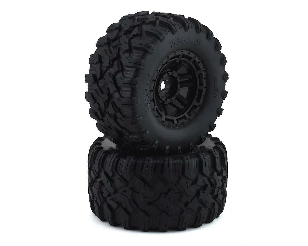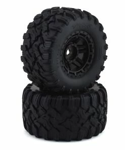 Traxxas Maxx 2.8″ All-Terrain Pre-Mounted Tires. Package includes two replacement “TSM rated” tires, pre-mounted on black 17mm splined wheels.