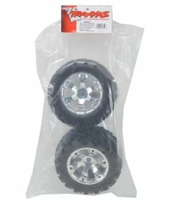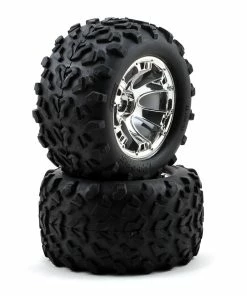 This is a set of two Traxxas Monster Truck Tires Pre-Mounted on Chrome Geode Wheels, intended for use with the Traxxas Revo, T-Maxx and Summit Monster Trucks equipped with the optional Traxxas 17mm Splined Wheel Hub and Nut Set (TRA5353X, TRA5353G or TRA5353R) and Traxxas Beadlock-Style Sidewall Protectors (TRA5665, TRA5666 or TRA5667). These tires are pre-glued with installed foam inserts.