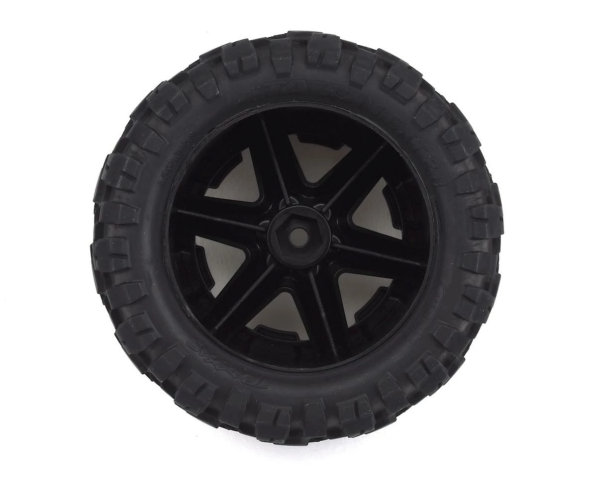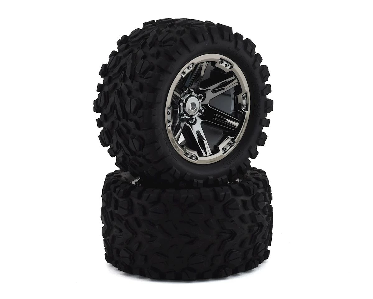 This is a pair of Traxxas Talon EXT 2.8″ Tires, Pre-Mounted on Black Chrome RXT Wheels. These wheels feature a 12mm hex and are glued, and ready for use. For use on the rear of the Rustler VXL and Rustler.