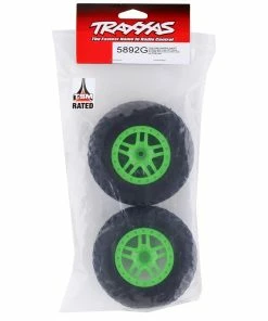 Traxxas SCT Off-Road Pre-Mounted Tires with Split-Spoke Wheels. These pre-mounted tires are intended as 4WD front or rear and 2WD rear Traxxas Slash models. Package includes two pre-mounted tires on green wheels.