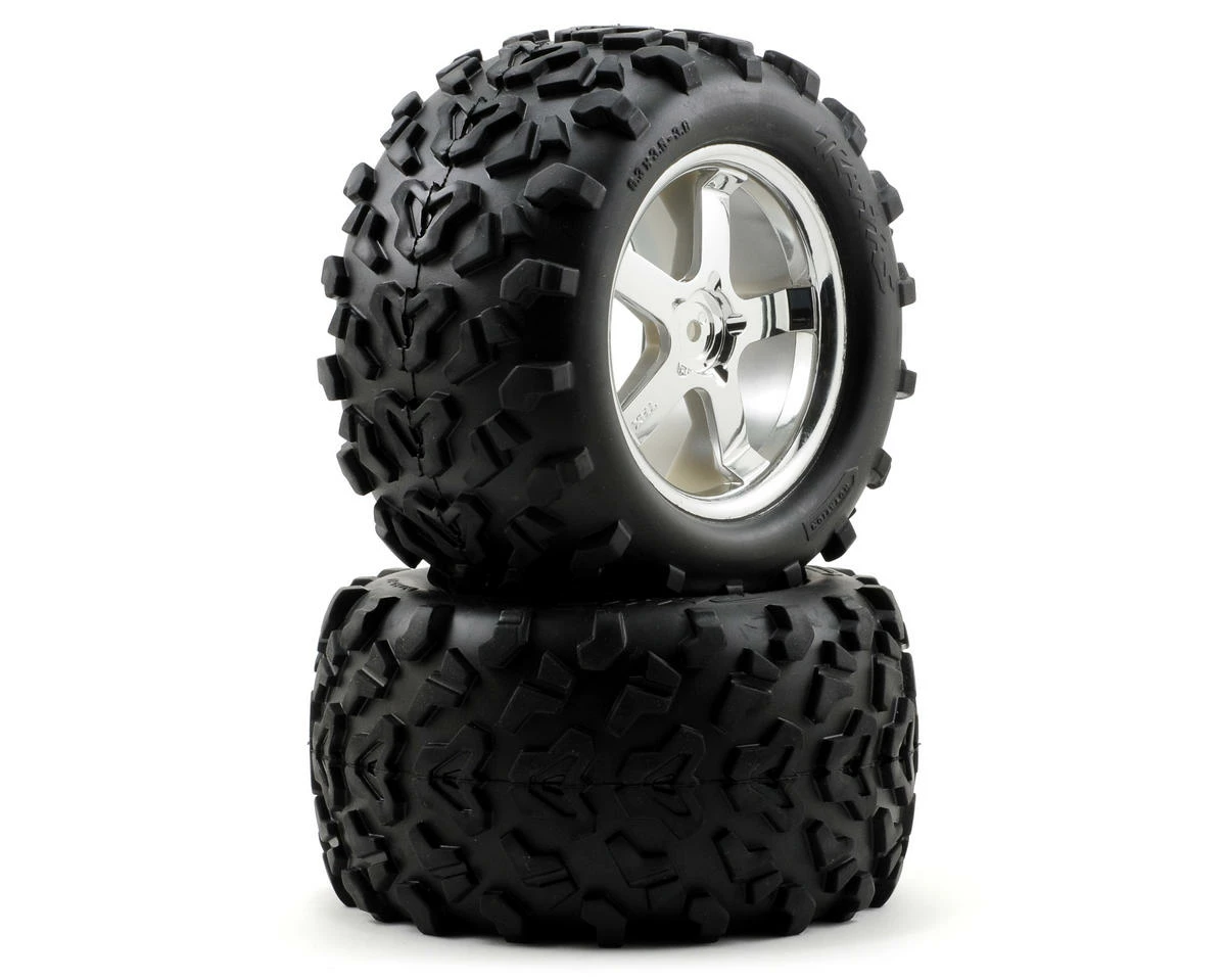 Tires & wheels, assembled, glued (Hurricane chrome wheels, T-Maxx tires (6.3” outer diameter), foam inserts) (2) (fits Revo/Maxx series)