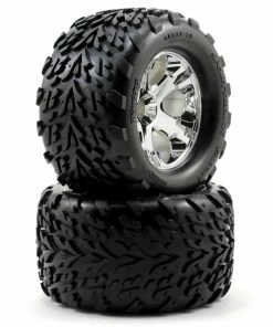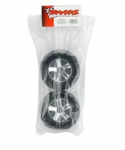 This is a pack of two Traxxas Talon Tires, premounted on All Star nitro front wheels. The Traxxas 2.8″ Talon tires are the most versatile all-terrain tires available for your Traxxas model. The directional long-wear tread pattern provides extended tire life, while providing exceptional traction on most any surface. The 2.8″ Talon integrates a soft rubber compound, large foam inserts, and a go-anywhere design that allows it to excel on asphalt as well as rocks, grass, dirt, or any other surface. The tapered tread design where the treads meet the sidewall enables the tire to slide on asphalt, to help avoid unwanted traction rolls. Increase the ride height and ground clearance of any Traxxas stadium truck by adding a set 2.8″ Talon tires.