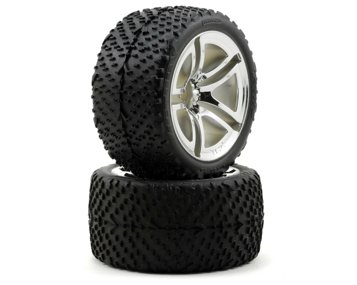 This is a pair of Rear Traxxas Pre-mounted Twin Spoke wheels with Victory tires. Victory rear tires incorporate the ultra low-profile 2.8″ design with a race-inspired tread pattern that is sure to hook-up on almost any off-road surface. Victory tires incorporate a super-soft compound, tuned foam inserts, and an aggressive tread design for maximum high-traction handling. The rear Victory tire is ideal for medium to hard packed surfaces and it is comprised of medium sized āVā pins and larger directional āVā treads down the inner, outer, and center-line of the tire.