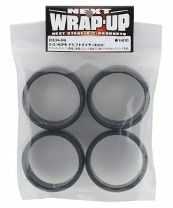This is a pack of four WRAP-UP NEXT X-3 HDPE Drift Tires. These redesigned tires are dedicicated to two-wheel drive and made from a resin material in a rounded, stable configuration. This design makes the tires suitable for many drift surfaces. The pack includes four urethane fixing strips.Â