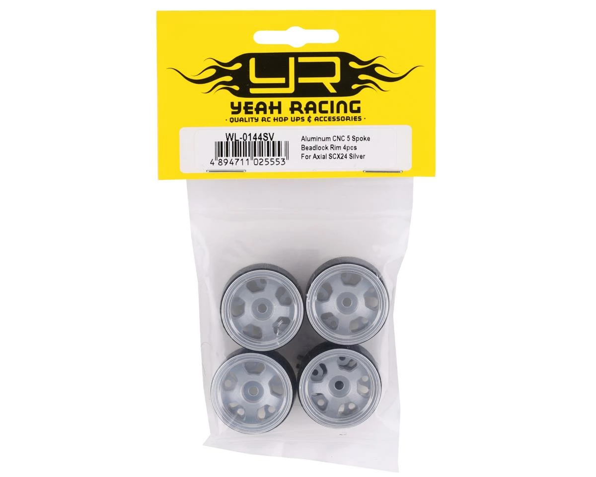 Yeah Racing SCX24 1.0″ Aluminum 5 Spoke Beadlock Wheels. These optional wheels are a great for adding scale performance to the Axial SCX24. Package includes four beadlock wheels with hardware.