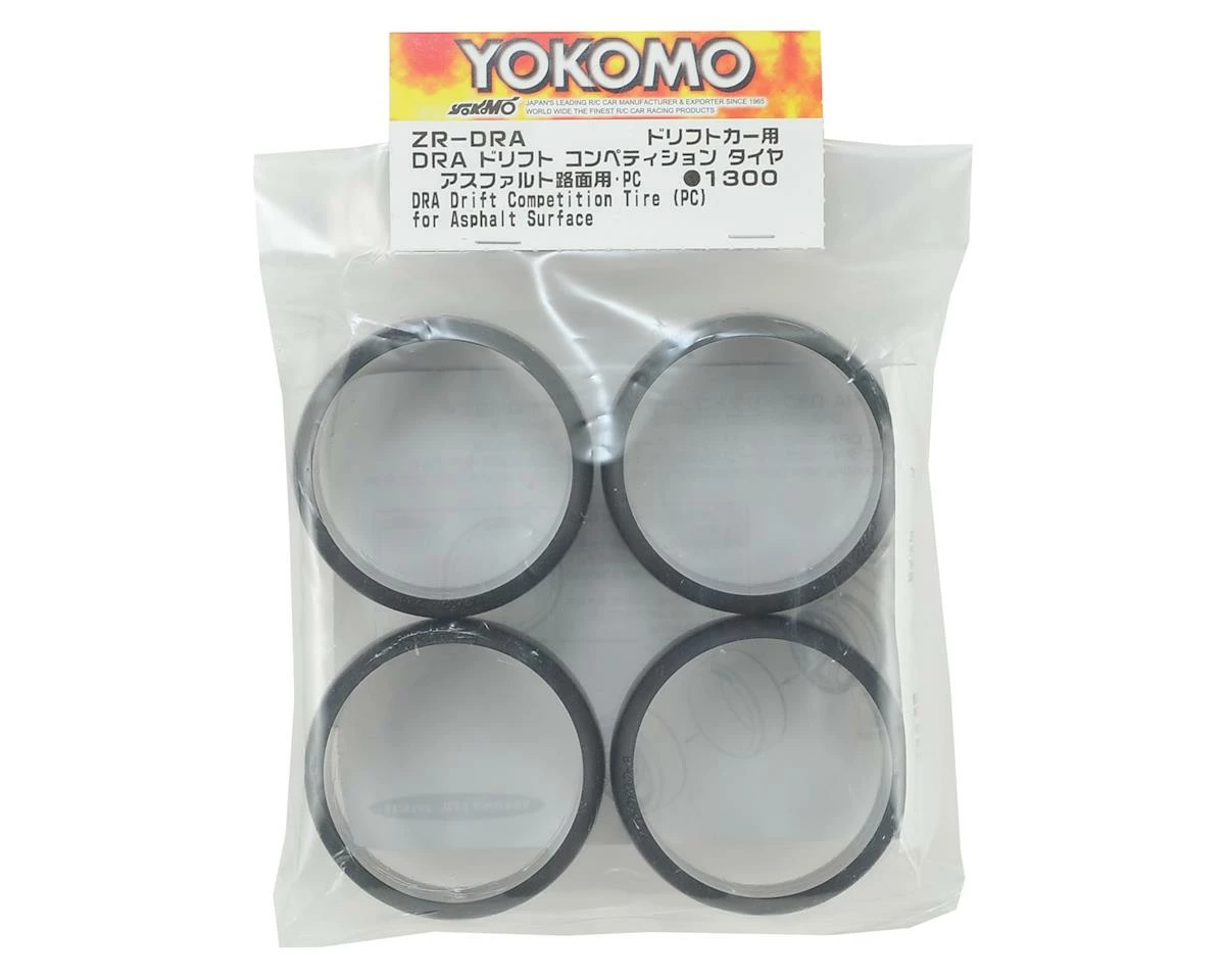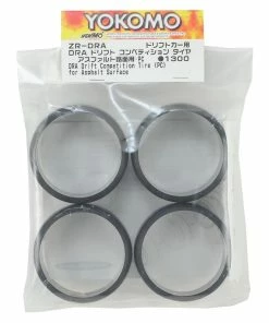 This is a pack of four Yokomo DRA Competition Drift Tires for use on Asphalt surfaces. This is a solid type competition resin drift tire DRA. It is the optimum compound for asphalt road surface and features an updated design of tire thickness, tread shape and sidewall shape.